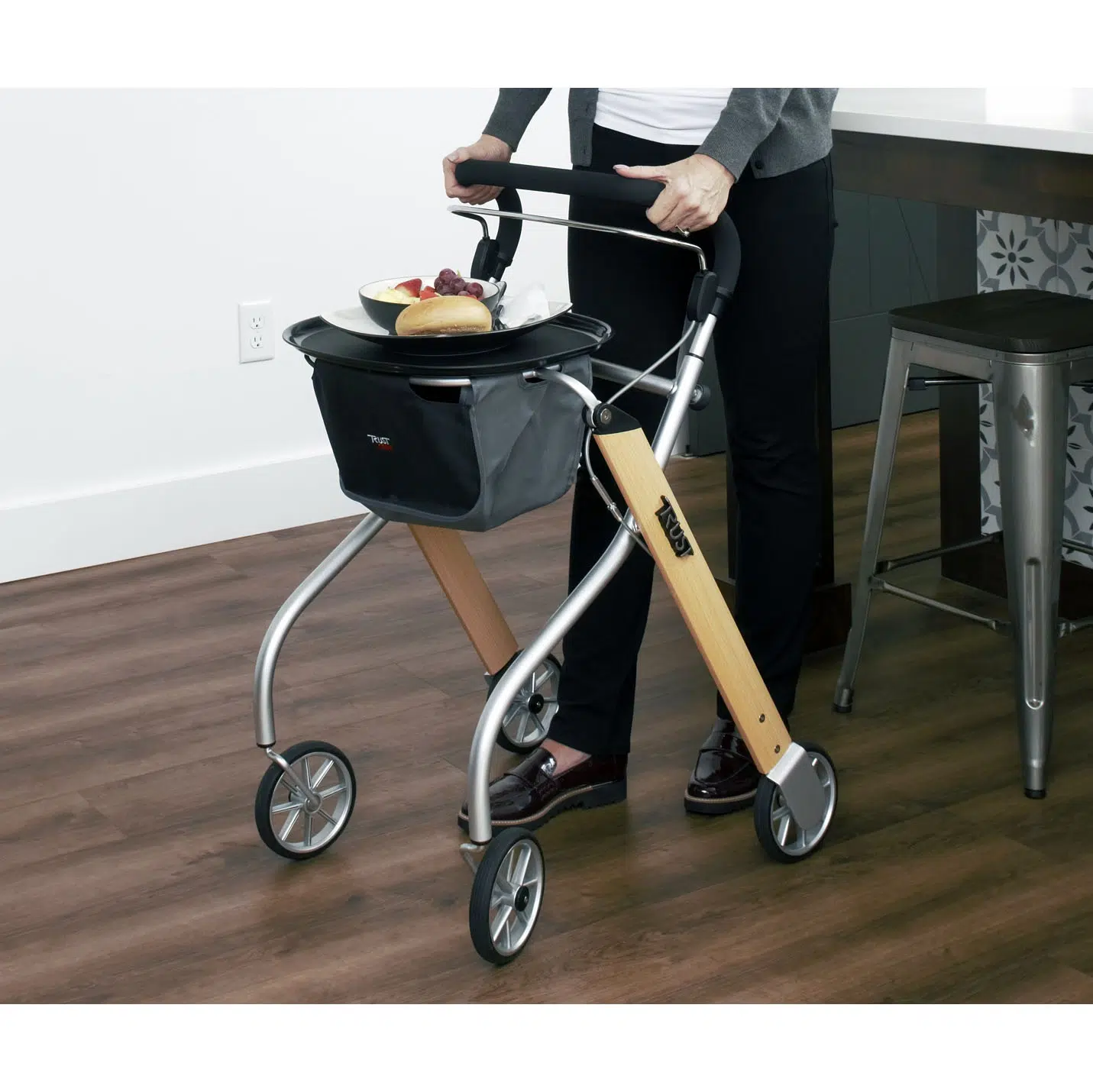The Let’s Go Rollator doubles as a trolley cart and TV Tray. Use the included tray and basket to trolley food, beverages, and other items around the house without fear of spilling. Turn the rollator around and pull the tray up to your lap to use it as a TV dinner tray to enjoy meals while sitting in the comfort of your favorite chair.
